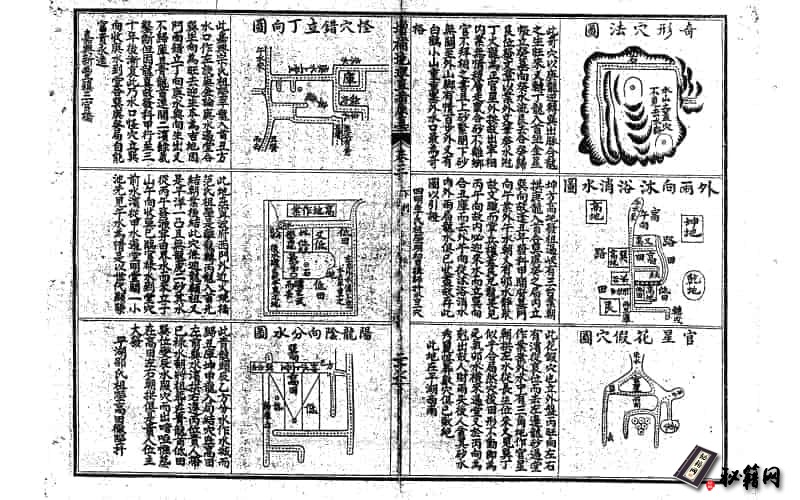 予尤必历考诸书,研穷精奥而焚修之暇,往往讨论经言控其旨而得其归。故扵经之所隐讳者则显达之,扵时论所偏僻者辨别之,又宪宫言无凭,其扵金木水火四局之中配生旺墓养之及以四维四墓变局之向同归局库,更有生旺水不上堂,从沐浴方消,又有山上奇形水口怪穴种种不同,咸绘图式以备参考。